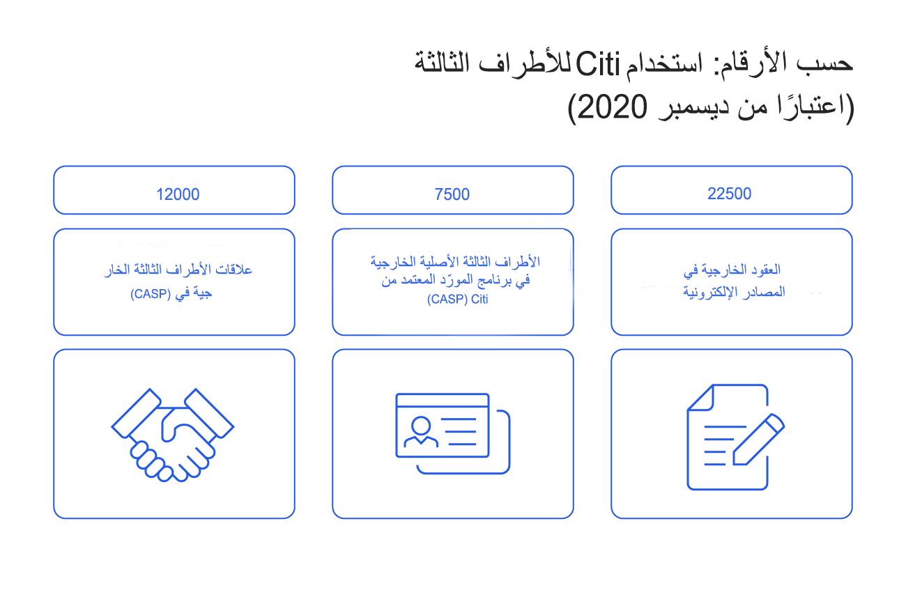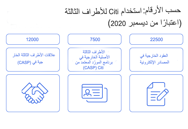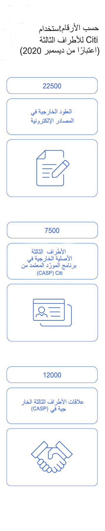 تمتلك Citi 22500 عقد خارجي في المصادر الإلكترونية. يوجد 7500 طرف ثالث أصلي في برنامج المورّد المعتمد من Citi (Citi-Approved Supplier Program (CASP)) و12000 علاقة بأطراف ثالثة خارجية في CASP.