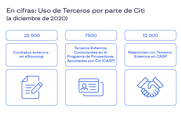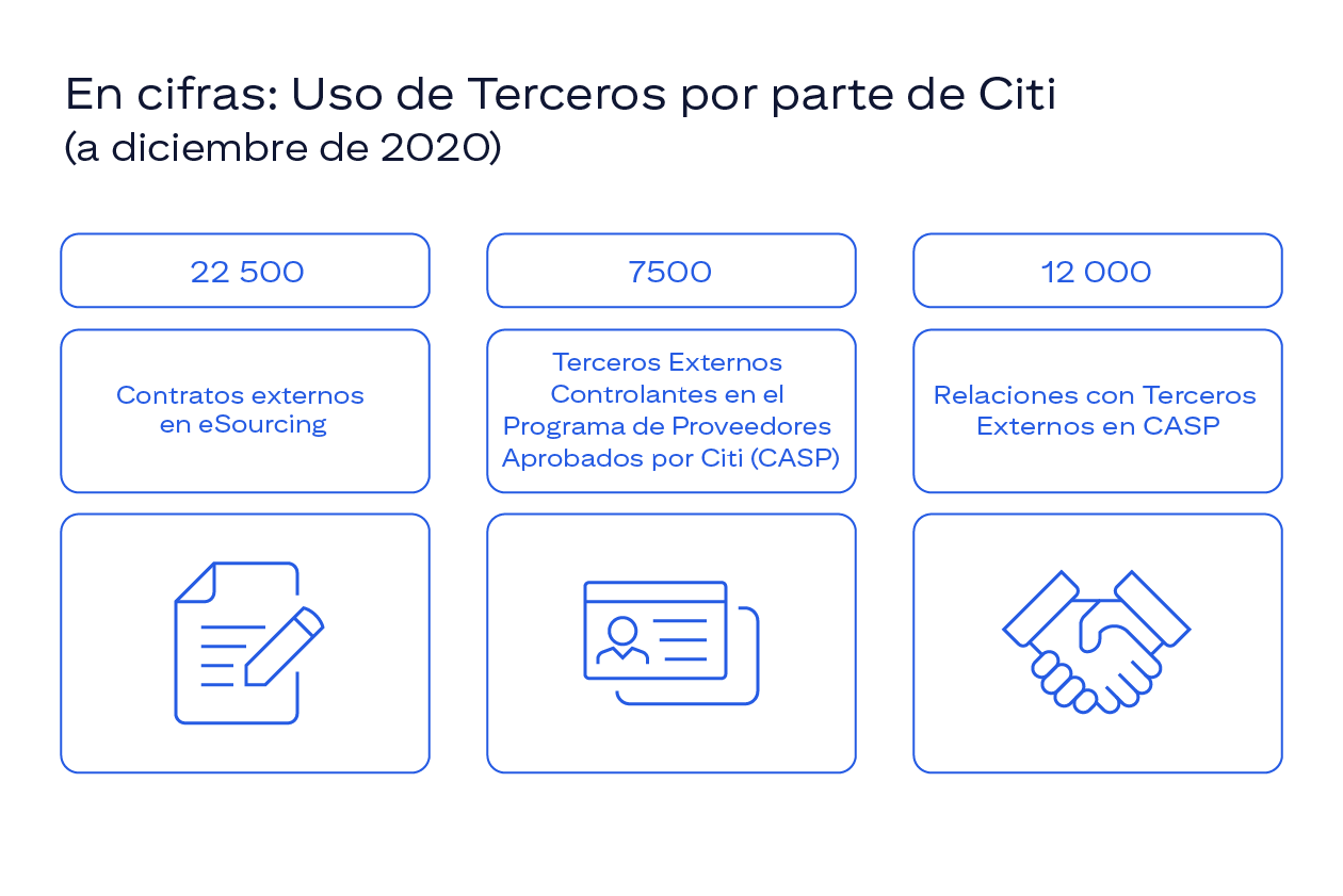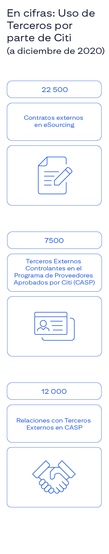 A diciembre de 2020, Citi mantenía aproximadamente 12 000 relaciones con Terceros externos con más de 7500 empresas controlantes de Terceros.