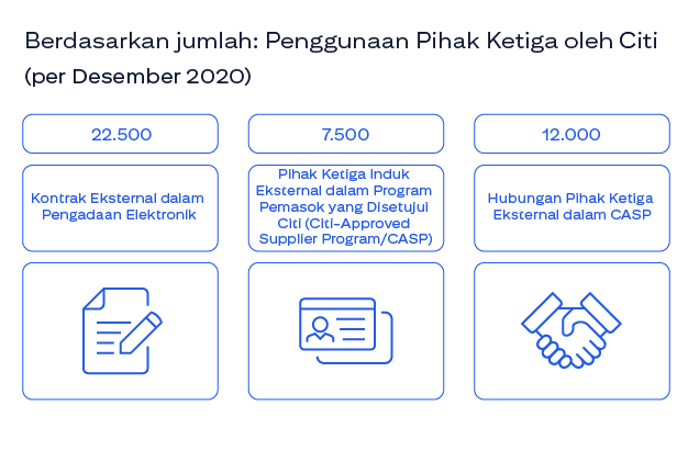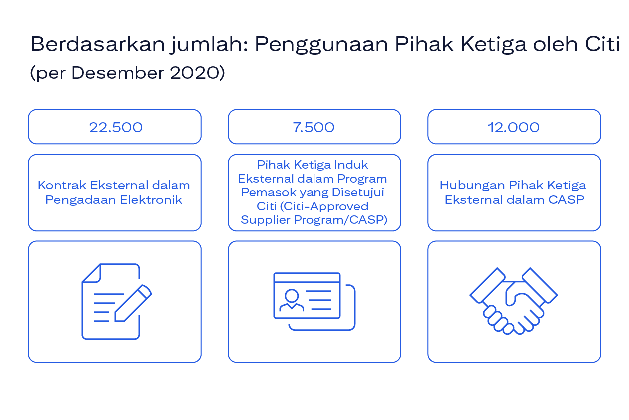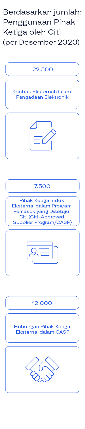 Sejak Desember 2020, Citi memiliki sekitar 12.000 hubungan Pihak Ketiga eksternal dengan lebih dari 7.500 perusahaan induk Pihak Ketiga.