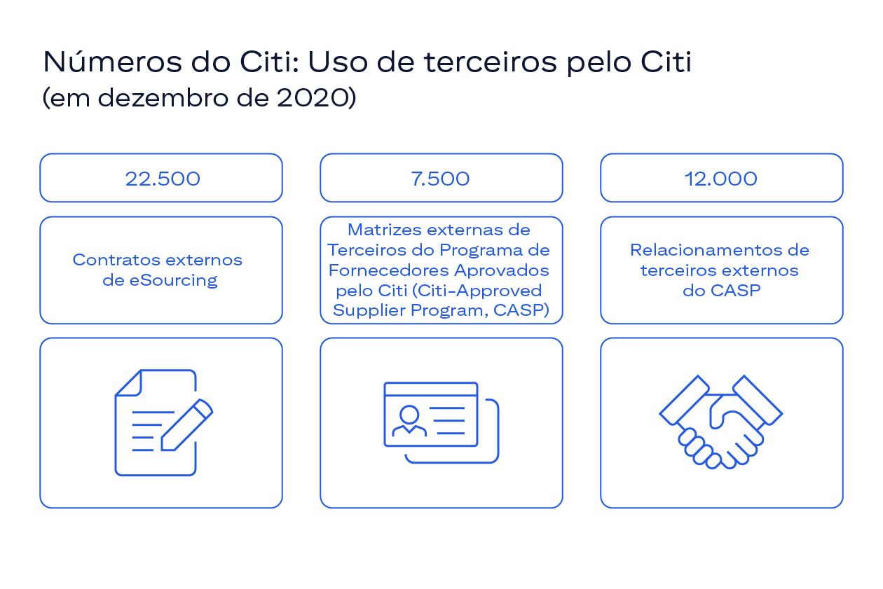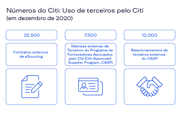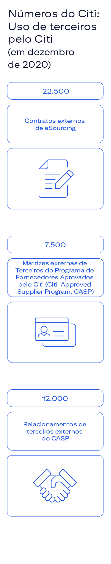 O Citi tem 22.500 contratos externos em eSourcing. Há 7.500 matrizes de Terceiros Externos no Programa de Fornecedores Aprovados pelo Citi (CASP) e 12.000 relacionamentos com Terceiros Externos no CASP.