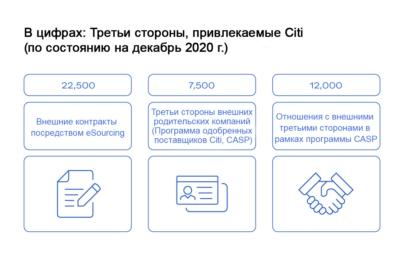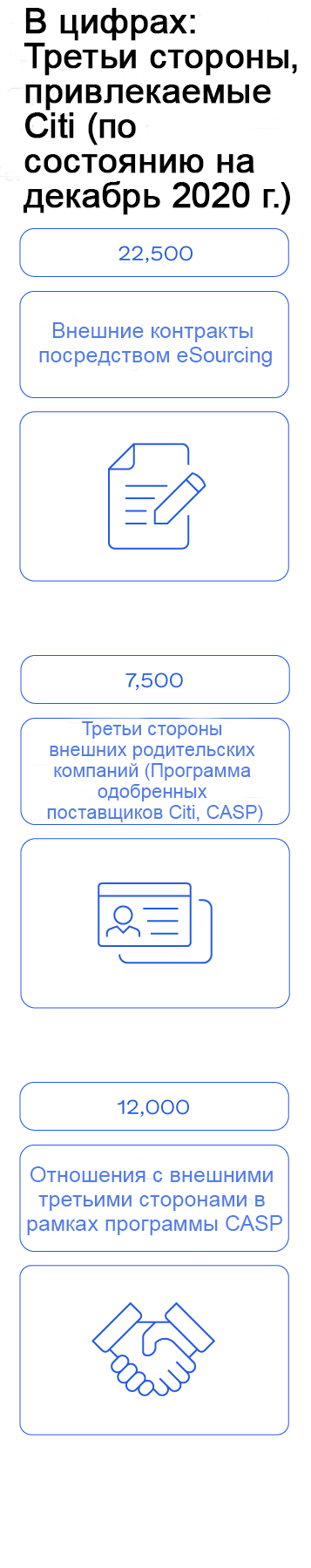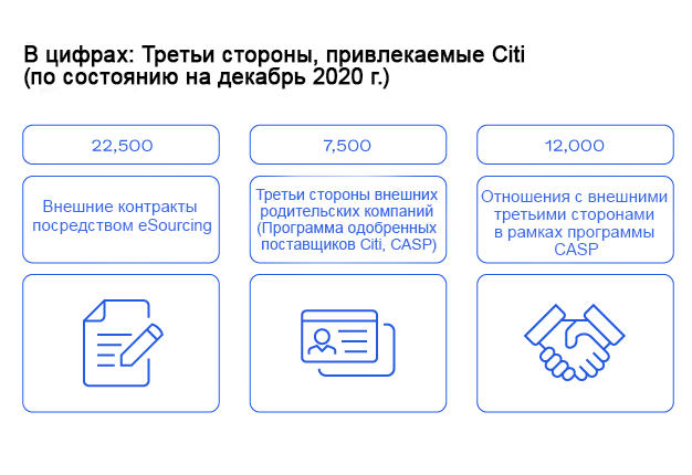 По состоянию на декабрь 2020 г., Citi сотрудничал с примерно 12 000 внешними третьими сторонами и с более чем 7 500 материнскими компаниями третьих сторон.