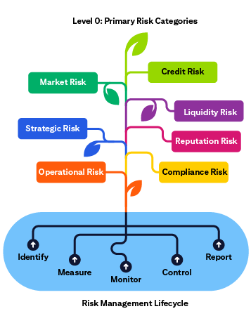 A tree with roots formed by the Risk Management Lifecycle: Identify, Measure, Monitor, Control, Report. The tree’s branches are the Level 0 Primary Risk Categories: Market Risk, Strategic Risk, Operational Risk, Credit Risk, Liquidity Risk, Reputation Risk, Compliance Risk.