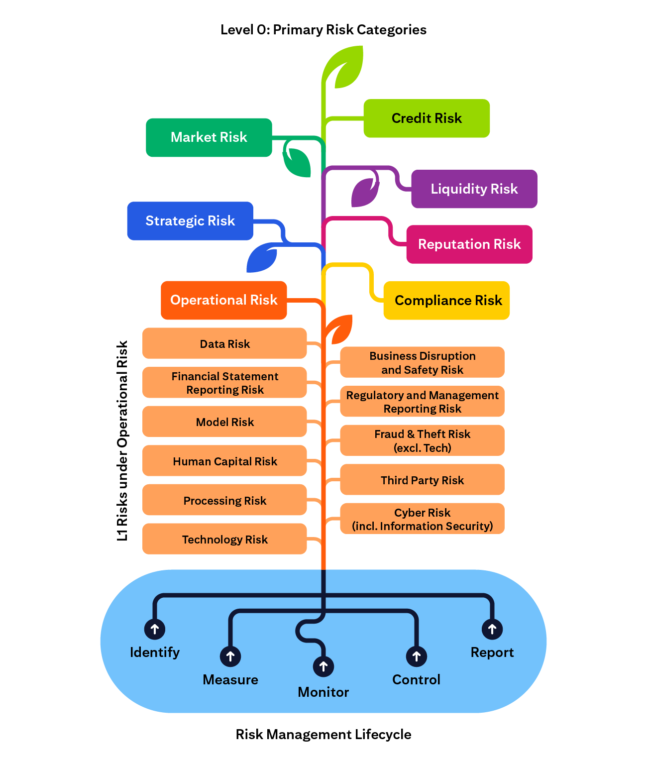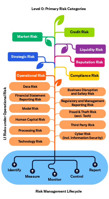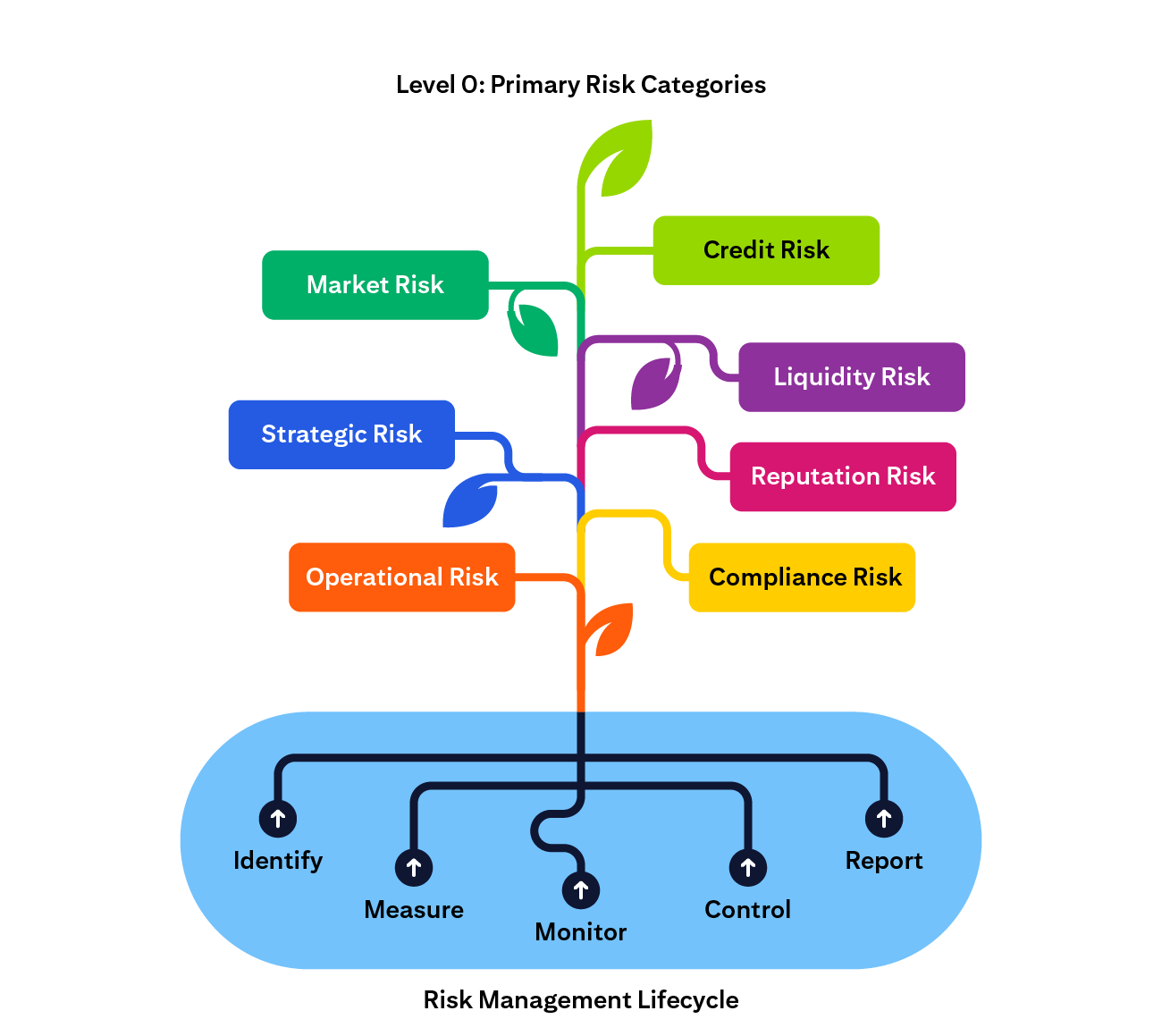 A tree with roots formed by the Risk Management Lifecycle: Identify, Measure, Monitor, Control, Report. The tree’s main branches are the Level 0 Primary Risk Categories: Market Risk, Strategic Risk, Operational Risk, Credit Risk, Liquidity Risk, Reputation Risk, Compliance Risk.