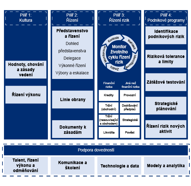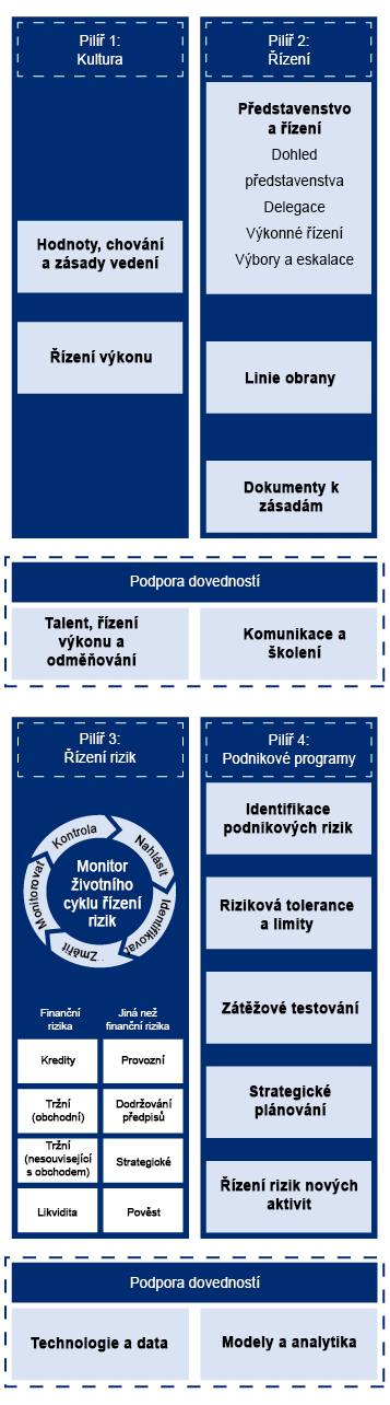 Pilíř 3: Řízení rizik zahrnuje životní cyklus řízení rizik (identifikace, měření, monitoring, kontroly, vykazování), finanční rizika (úvěrové, tržní – obchodní, tržní – neobchodní, likviditní) a jiná než finanční rizika (provozní, dodržování předpisů, strategická, reputační).