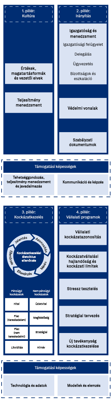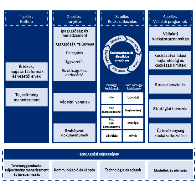 4. pillér: A Vállalati programok lefedik a vállalati kockázatok azonosítását, a kockázatvállalási hajlandóságot és korlátokat, stressztesztelést, stratégiai tervezést és az új tevékenységek jóváhagyását.