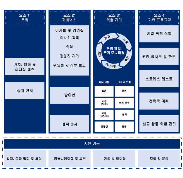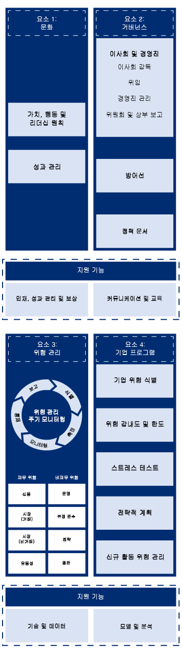 요소 3: 위험 관리에는 위험 관리 주기(식별, 특정, 모니터링, 통제, 보고), 재무 위험(신용, 시장(거래), 시장(비거래), 유동성), 비재무 위험(운영, 규정 준수, 전략, 평판)이 포함됩니다.