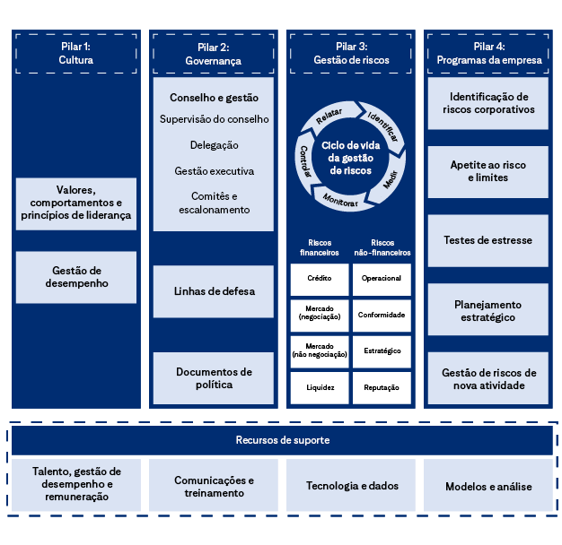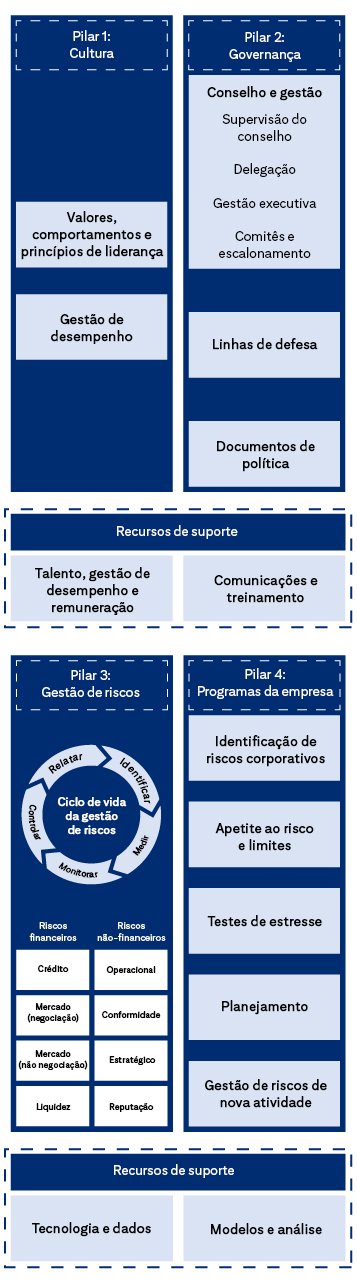 Pilar 4: Programas da empresa inclui identificação de riscos corporativos, apetite ao risco e limites, teste de estresse, planejamento estratégico e aprovação de novas atividades.