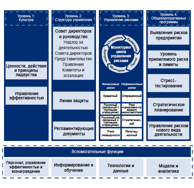 Уровень 4: К корпоративным программам относятся выявление рисков предприятия, уровень приемлемого риска и лимиты, стресс-тестирование, стратегическое планирование и утверждение новой деятельности.