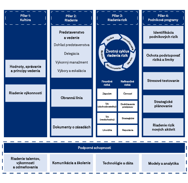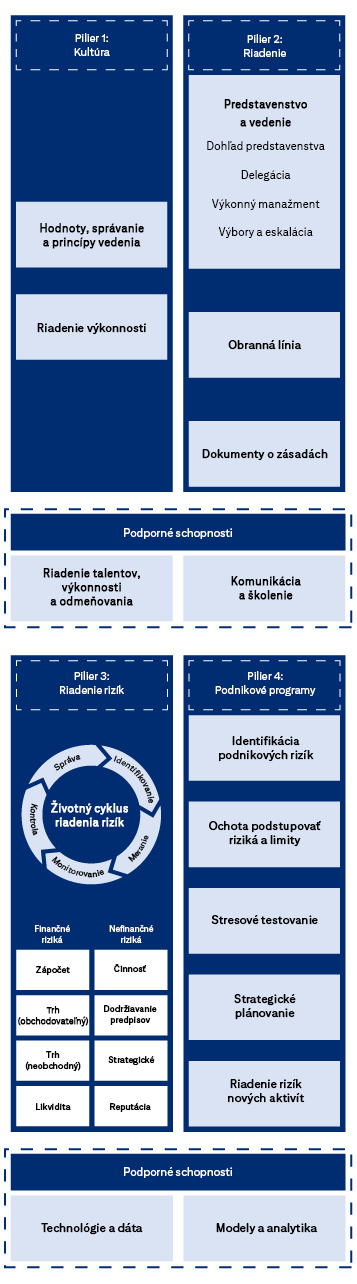 Pilier 3: Riadenie rizík zahŕňa životný cyklus riadenia rizík (identifikácia, meranie, monitorovanie, kontrola, hlásenie), finančné riziká (úverové, trhové (obchodné), trhové (neobchodné), riziká likvidity) a nefinančné riziká (operačné, dodržiavanie predpisov, strategické, reputačné).