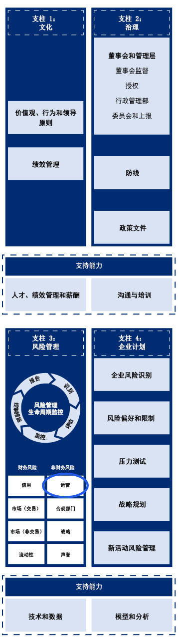 支柱 2:治理包括董事会和管理层、董事会监督、授权、行政管理部、委员会和上报、防线,以及政策、标准和程序。