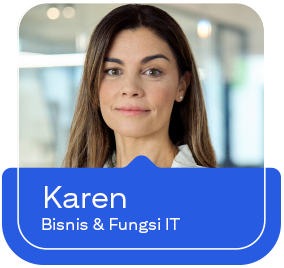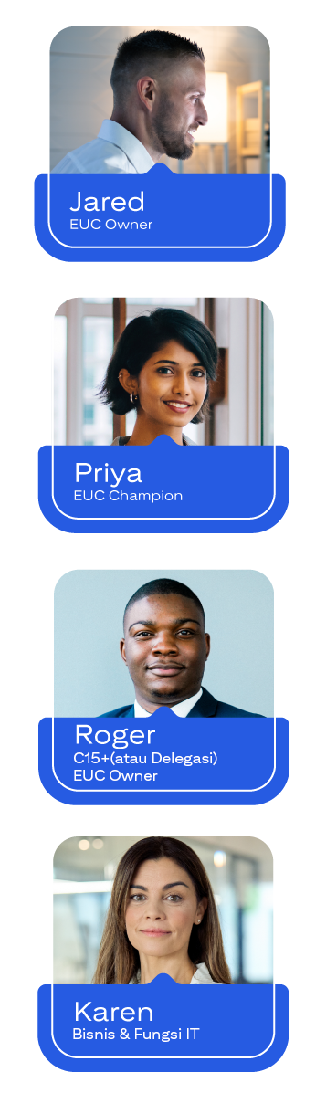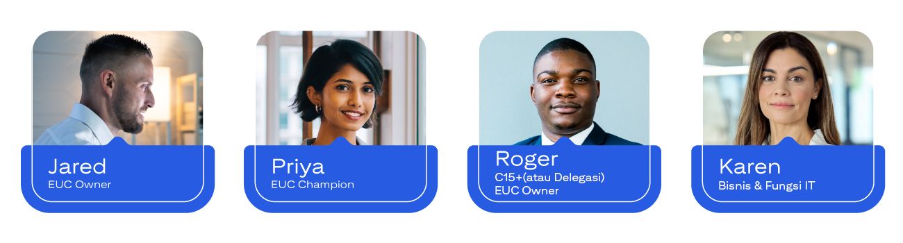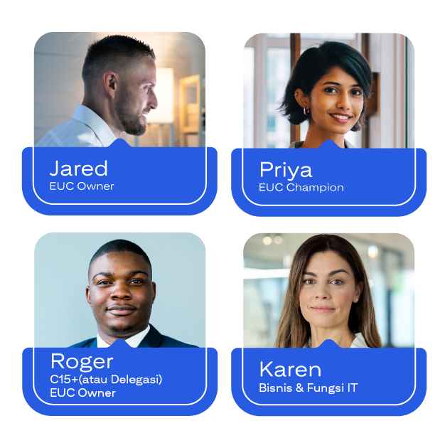 Gambar anggota utama tim EUC, yang meliputi: Jared: EUC Owner, Priya: EUC Champion, Roger: EUC Owner C15+ (atau Delegasi), Karen: Bisnis & Fungsi IT