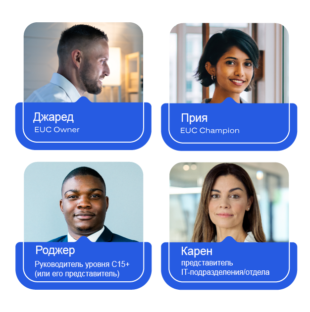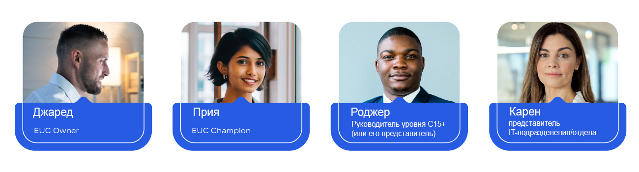 Изображения ключевых сотрудников команды EUC: Джаред: EUC Owner, Прия: EUC Champion, Роджер: руководитель уровня C15+ (или его представитель), Карен: представитель IT-подразделения/отдела