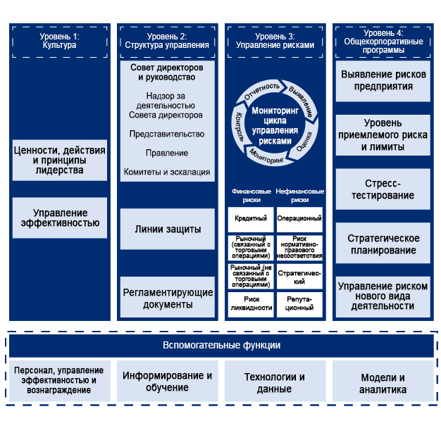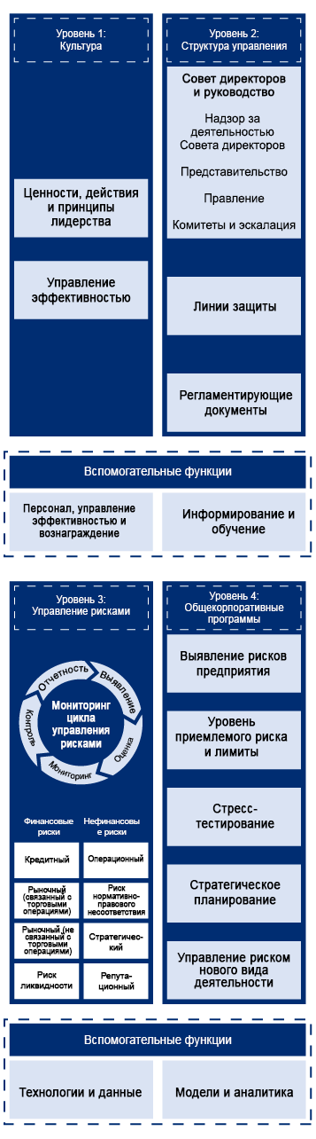 Уровень 4: К корпоративным программам относятся выявление рисков предприятия, уровень приемлемого риска и лимиты, стресс-тестирование, стратегическое планирование и утверждение новой деятельности.