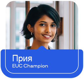 В этом курсе вы познакомитесь с EUC Owner Джаредом и EUC Champion Прией, которые представят вам практические примеры, иллюстрирующие EUC и жизненный цикл ITeSS. Они сотрудничают с другими ключевыми членами команды: