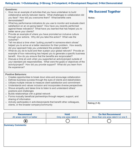 You will need to refer to the notes you have taken and then consider how they compare to the positive behaviors for each competency. Compare your notes with the positive behaviors in the Interview Guide only after the interview is complete.