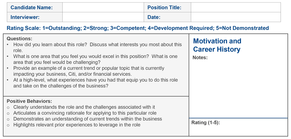 The Citi Leadership Principles Interview Guides provide you with the questions you will need for most interviews, so you should not need to generate your own. Be sure to pre-select questions and use them consistently across candidates for a certain role. If you do generate your own questions, use them consistently across every candidate for the role.