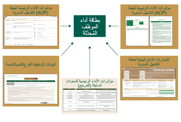 تتكوّن بطاقة أداء الموظف لأدوار صندوق الاستثمارات العامة وصولًا إلى مستويات N-3 من مؤشرات الأداء الرئيسية الأساسية، والمُشتركة، والمُرتبطة بالمُبادرة. يمكن أن يكون لأنواع مؤشرات الأداء الرئيسية مصادر بيانات مُختلفة ناتجة عن التسلسل المباشر وغير المباشر.