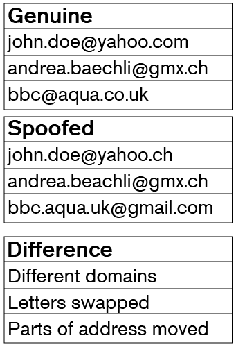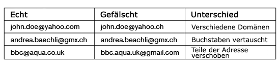 Die E-Mail-Adresse muss sorgfältig geprüft werden. Nachstehend einige Beispiele für gefälschte E-Mail-Adressen: