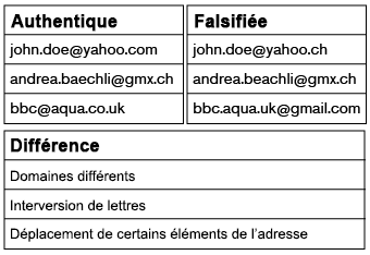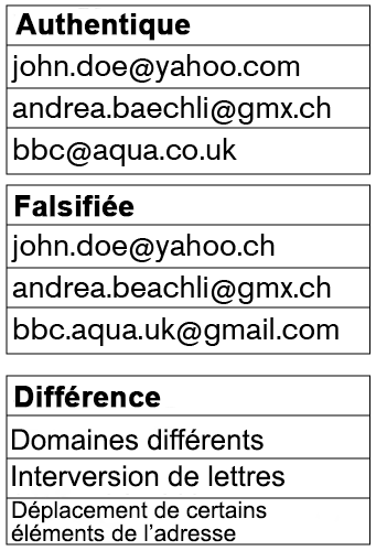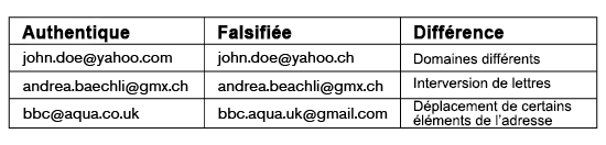L’adresse e-mail doit être vérifiée avec attention. Voici des exemples d’adresses e‑mail falsifiées: