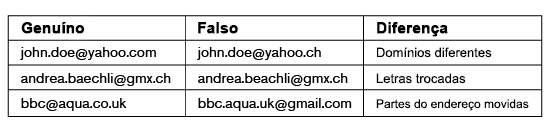 O endereço de e-mail deve ser cuidadosamente verificado. Exemplos de endereços de e-mail falsificados estão abaixo: