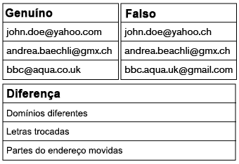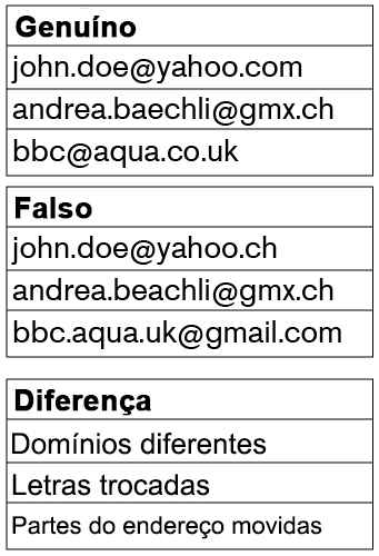 Exemplo 1: E-mail john.doe@yahoo.com genuíno, john.doe@yahoo.ch falsificado, Diferença Domínios diferentes