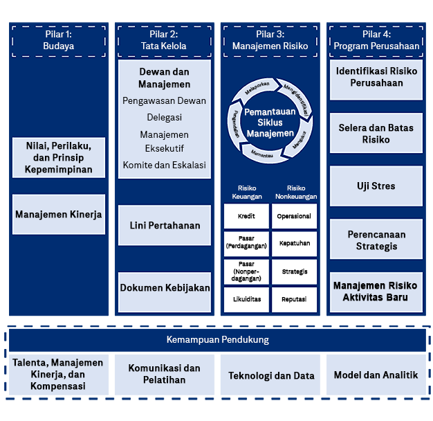 Pilar 4: Program Perusahaan meliputi Identifikasi Risiko Perusahaan, Selera Risiko dan Batas Risiko, Uji Stres, Perencanaan Strategis, dan Persetujuan Aktivitas Baru.
