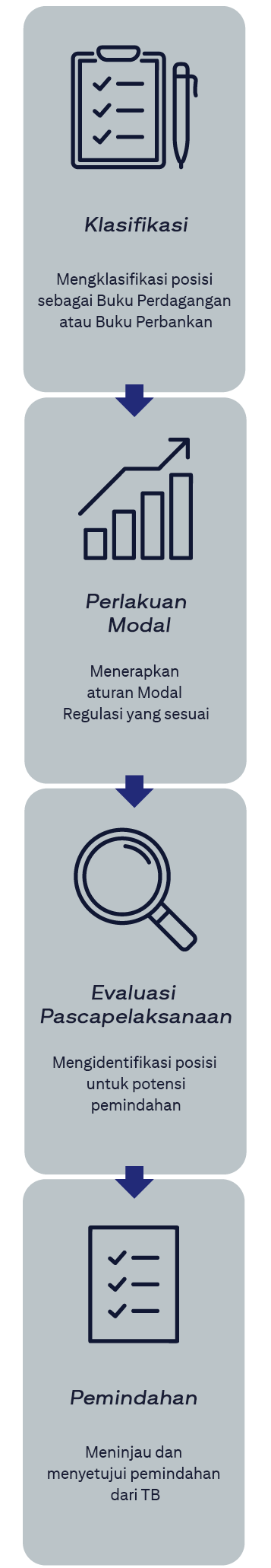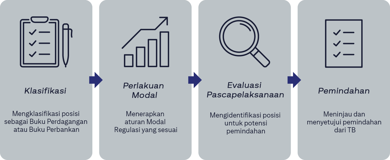 Klasifikasi: Mengklasifikasi posisi sebagai Buku Perdagangan atau Buku Perbankan. Perlakuan Modal: Menerapkan aturan Modal Regulasi yang sesuai. Evaluasi Pascapelaksanaan: Mengidentifikasi posisi untuk potensi pemindahan. Pemindahan: Meninjau dan menyetujui dari TB